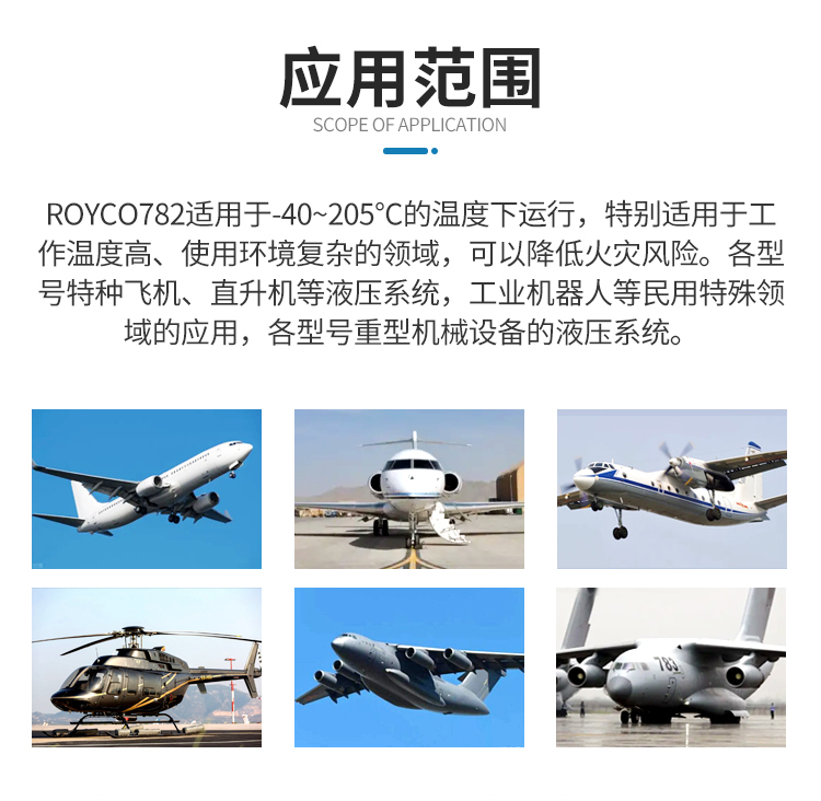 Royco782航空液壓油是一種符合MIL-PRF-83282的、耐高溫的合成型航空液壓油。該產(chǎn)品廣泛應(yīng)用于各類型飛機(jī)的航空液壓系統(tǒng)。由于其閃點(diǎn)高,因此常常薦用于航發(fā)等相關(guān)高溫部位的航空液壓油系統(tǒng)。