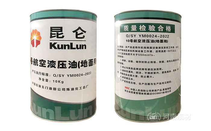 2.信息清晰化:罐體中部以醒目黑色字體標注“昆侖10號航空液壓油(地面用)”,下方明確執行標準Q/SY YM0024-2022(較舊版標準更新),同步標注凈含量10Kg、生產單位,信息層級分明,便于用戶快速獲取關鍵參數。
